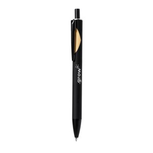 Bolígrafo puntero de mecanismo pulsador en original combinación de cuerpo en cartón reciclado de color natural y accesorios en vivos colores con puntero negro. Tinta azul.